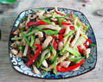 5、再下排骨一起翻炒,加盐、鸡精、酱油和美人椒段翻炒均匀即可。