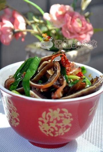 做这个腊猪耳都是提前煮熟了放在冰箱里冻着的,这样下次吃比较方便,因为腊货煮起来比较费事儿,要煮就一次性的都煮好了哈