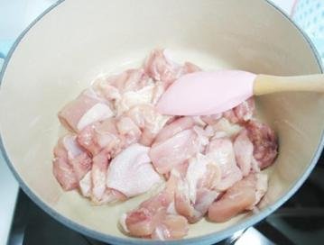 2、取一锅倒入些许油后放入切块的鸡肉。