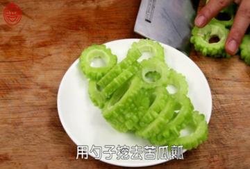 1. 苦瓜两根,切去头尾再切成较厚的片,用勺子挖去苦瓜瓤。