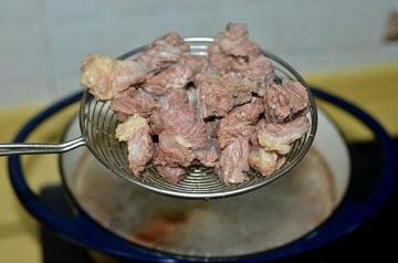 3、大火烧开后开盖继续煮2分钟,将牛肉捞出沥干备用。