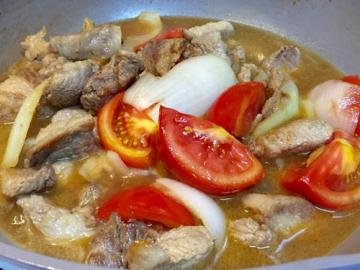 2、梅花肉切ㄧ口大小,番茄切大块,洋葱剥成大片。
