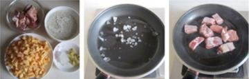 排骨红薯糯米饭的做法也很简单,只需两步:先用冰糖炒糖色,加入排骨翻炒上色,再加入红薯和糯米翻炒几下后,加入盐调味;第二步就是将翻炒混合的排骨红薯糯米一起放入电饭煲中去煮即可。掀开电饭煲中的盖,香气扑鼻,赶紧盛上一碗给小朋友吃,结果没多会儿,就拿着碗来说还要吃。