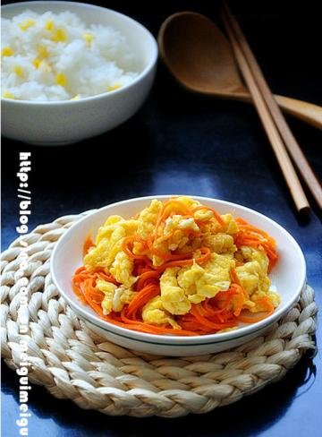红萝卜入锅之前要先汆烫一下,这样会变软,鸡蛋里放一点盐和料酒再打散,一来遮腥味,二来可以提鲜让鸡蛋变得滑嫩。