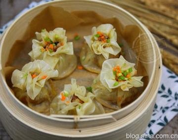 7、将烧麦皮收拢起来,在半腰处捏褶子,中间留一小口露出馅料,上面的面皮外翻,如图,一个烧麦就做好了。