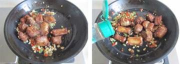 3、炸好的排骨再用蒜末炒制一下, 让蒜香更入味。