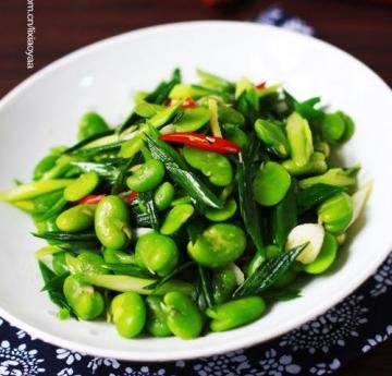 新鲜的蚕豆搭配嫩蒜苗,碧绿脆嫩很小清新的一盘家常小菜,制作时蚕豆要先煮到9成熟,然后爆炒蒜苗后直接放入蚕豆炒熟即可享用了,很是简单美味的一道特色小菜。