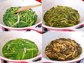 3、再接着原锅放入葱绿部分,小火慢炸并不时地搅拌一下,让葱绿受热平均~炸至微焦黄色后再放入先前捞出的葱白再一起炸片刻即可。(炸葱段的过程约需20~25分钟)