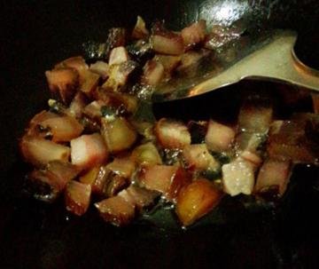 5、锅置火上烧热后,倒入少量油烧热,将腊肉放进锅里翻炒。