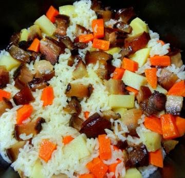 主料:大米1.5杯、腊肉280克、胡萝卜1/2根、土豆2个