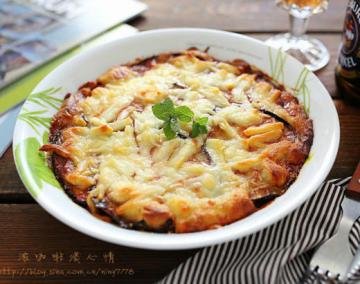 6、然后放入提前预热好的烤箱中,上下火180度,再烤15-20分钟,至表面微微变焦黄乳酪融化,取出趁热食用。