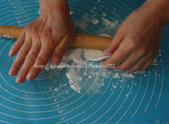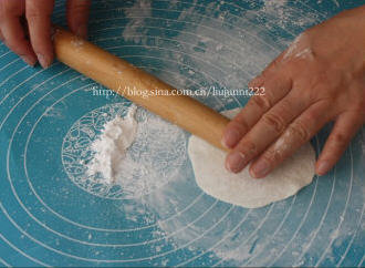 2.面皮也可以买现成的饺子皮,用擀面杖将饺子皮的边缘擀薄成荷叶边即可;
