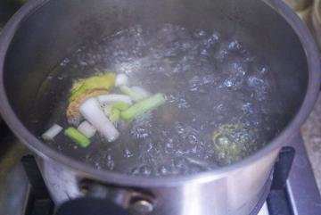 2.锅内倒入清水和切好的姜葱,煮沸;