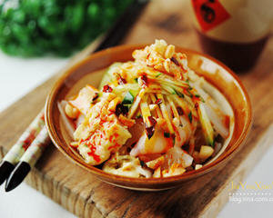 14、码上黄瓜丝,浇上步骤12的调味汁(不喜欢吃到蒜的浇的时候可以把蒜渣过滤器掉不要),再浇上一大勺油泼辣子,喜欢芝麻酱的请自便(我不喜欢粘乎乎的感觉)。