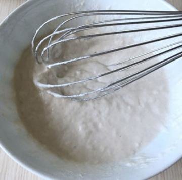 3、分两次加入剩下的水,搅拌成细腻可流动的面糊。加水的时候要等上一次加入的水充分搅拌均匀后再加第二次,这样不容易形成小疙瘩,如果感觉有少量疙瘩没搅开,可以盖保鲜膜静置15分钟再搅搅就行了。