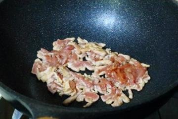 11、锅中再次倒入少许食用油,等待油温烧至六七成热时加入提前腌制好的肉丝大火快速翻炒。肉下锅后用大火快速爆炒才能保持鲜嫩的口感;