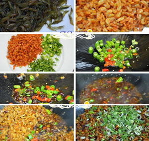4、少加一点水,因为辣椒酱和豆豉酱都很咸所以无需再加盐,再少加一点糖来提味,把小米虾放入翻炒入下味,最后撒入切好的蒜花出锅。