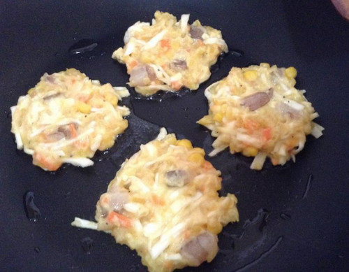 配料:玉米粒、红萝卜、高丽菜适量、鸡蛋1颗、面粉3大匙、水25ml、黑胡椒粒(粉)少许