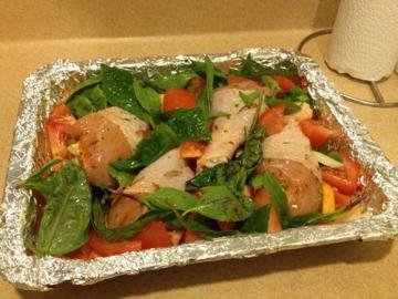 罗勒番茄烤鸡腿是一道十分简单的料理,将所有食材及调味料通通放进烤盘,等90分钟过后就完成了!搭配个生菜沙拉一餐就搞定。