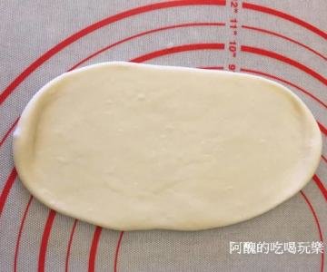 14、再芝麻面朝下,将面团捍成薄长型,芝麻面朝下放入烤盘。