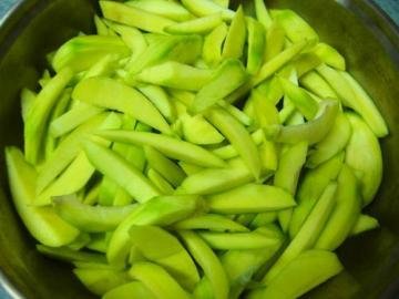 3、把青芒果切丝加入盐巴用手抓10分钟,静置去青涩苦水约1.5小时,将青涩苦水掉后,用开水洗净,加入糖拌匀。