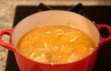 11. 大火将锅里的汤汁煮沸后,改为小火,继续加热15分钟后把110克棕味噌加进锅里。因为味噌酱比较粘,最简单的办法就是把味噌放在一个小滤篮里,沉入锅中,用调羹轻轻搅拌,让味噌化开,渐渐融入汤汁当中,然后关掉炉火盖上锅盖保温。味噌面汤至此就做好了。