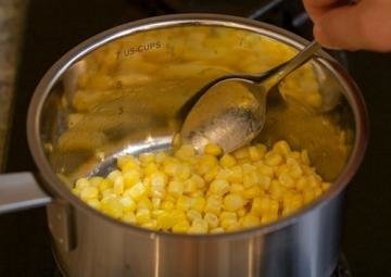 14. 黄油加热融化后表面开始出现泡沫,等泡沫开始消散的时候倒入100克玉米粒,翻炒2分钟,然后关火。如果用的是加盐黄油(Salted Butter),就不必再加盐,如果用的是不加盐的黄油(Unsalted Butter)就需要额外再加1/8茶匙,搅拌均匀,盖上锅盖保温备用。至此,味噌拉面的主要食材都已经准备好了,现在我们开始煮面。
