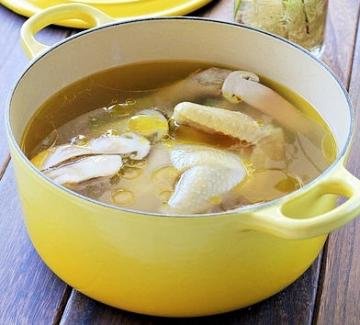 4、 松茸倒入鸡汤里再炖30分钟左右,用适量盐调味即可。