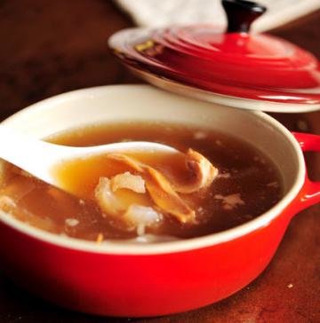 用月牙骨煲汤,一定要煲够时间。等月牙骨已经变成透明的筋状就差不多了,这时的月牙骨入口软滑香糯,连汤带骨一起消灭光,美味又营养。月牙骨墨鱼汤的另一个主角是墨鱼干,它是富含高蛋白,低脂肪,低热量的食材,很适合跟肉类搭配炖成鲜美的汤水。