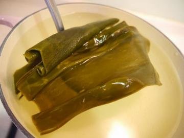 2、将冷水与昆布一起以大火煮开后将昆布取出。昆布切记勿久煮,会有杂质与黏液释出影响口感。