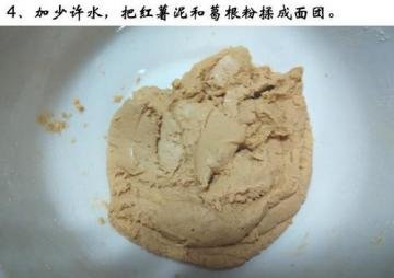 4、这时加少许水,把红薯泥和葛根粉揉成面团。