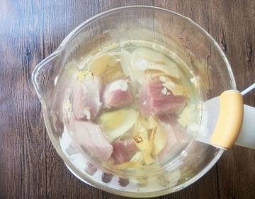 2、加入壶里,加水至1200ml。响螺有一点腥味,可以加一片姜。启动按键温泡+养生汤,或者用锅煮开后,关火,浸泡两小时。