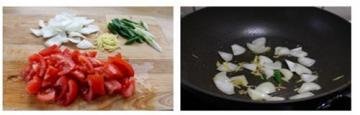 1.西红柿切块,洋葱切片,姜切丝,小葱斜切段。