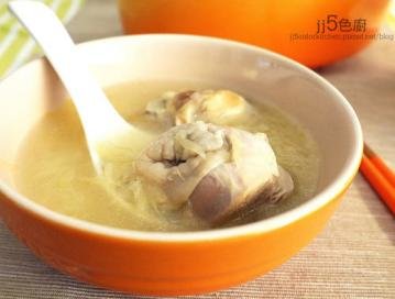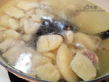 3、鸡肉热水川烫去血水后,与柚子及姜片同放进已注水的汤锅内,烧开后捞起杂质,盖上锅盖,用小火煲两小时。