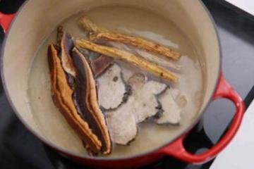 3、将赤灵芝片、党参、茯神及适量水用中火煮滚。