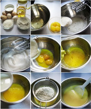 配料:白砂糖70克(48克加入蛋白中,剩余22克加入蛋黄中)、白醋少许