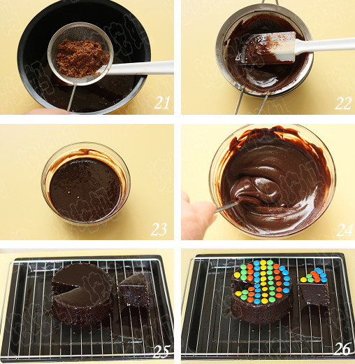 20、将巧克力甘纳许均匀的倒在蛋糕表面,用刮刀抹平。