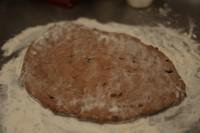 4、把面团倒在洒满干面粉的台面上,用手把面团拍成4cm左右厚的面饼。