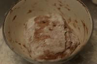 2、把高筋面粉,可可粉,巧克力豆一股脑全部倒进溶液中,拌匀。
