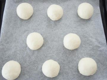5、将每个面团压扁后重新滚圆,排在铺有烘焙纸的烤盘上。盖上保鲜膜,进行30分钟的最后发酵。