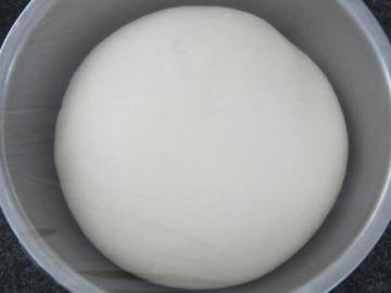 2、打好的面团用手滚圆后,放入已抹油的钢盆内,再盖上保鲜膜,放到温暖处进行第一次60分钟的发酵。