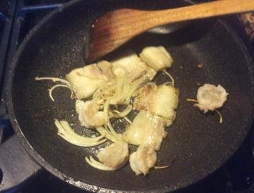 6、起油锅,放少许蒜末,一些洋䓤丝爆香,放几个虾仁,几片肉片,虾熟、肉片煎香。