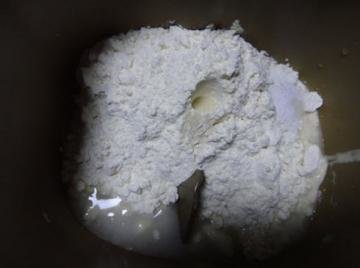 1、将弃种根据配方比例放入面包机搅拌桶进行和面