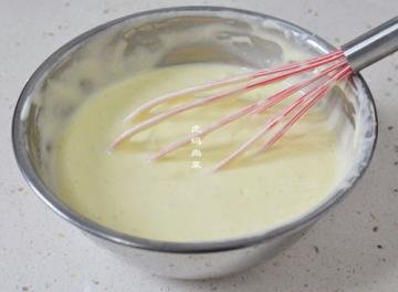 9、用手动打蛋器,也用挑起落下的方式,翻拌成粘稠糊状,即成混合糊。