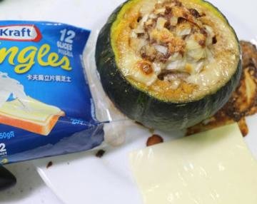 4、烤好的南瓜盅经过烤过有点萎缩是正常的,在准备一片卡夫起司盖在上面,再进烤箱只开上火h烤至起司开始融化即可出炉~~~