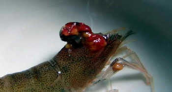 2、用剪刀挑出虾脑。黑的脑、红的血都出来了。