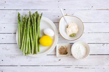 2、准备配料:芦笋,柠檬,蛋清,色拉酱,芥末酱,干淀粉,椒盐,食用油等