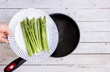 7、明虾球烹饪前,先处理配菜,芦笋洗净,切除老根切段备用