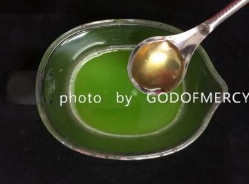 16、榨好的苦瓜汁倒进杯子里,如果觉得苦瓜汁太苦,接着再加入1勺蜂蜜。