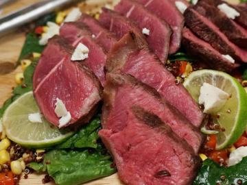 18、将切片好的牛排随意摆放在藜麦沙拉,将海盐或是玫瑰盐撒于牛肉上即可。
